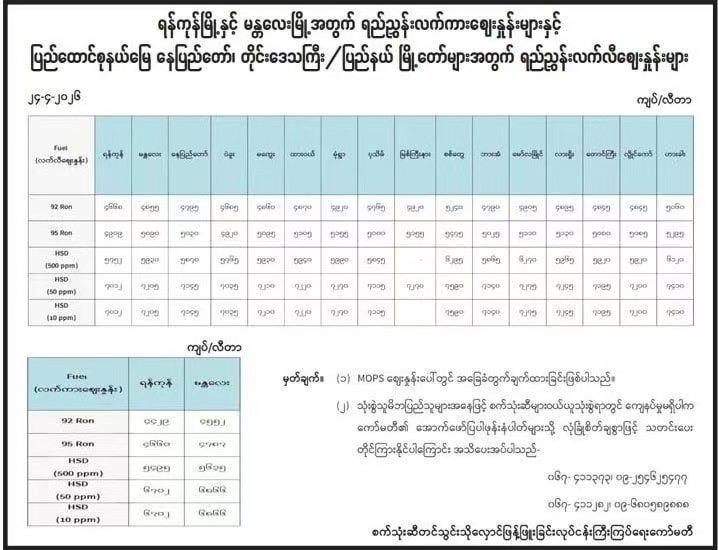 4月24日,缅甸燃油指导价较上周有所回落,92号汽油每升降了67缅币,95号汽油每升降了36缅币,普通柴油每升降了733缅币,优质柴油每升降了743缅币。燃油进口储销监管委员会公布了最新价格,目前在仰光,92号汽油为每升4668缅币,95号汽油为每升4909缅币,普通柴油为每升5752缅币,优质柴油为每升7012缅币。