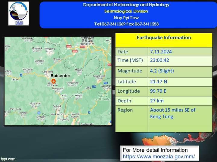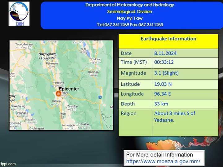 2024年11月8日,凌晨00点33分12秒,勃固省 耶达斜镇(ရေတာရှည်)附近发生了一次3.1级地震。