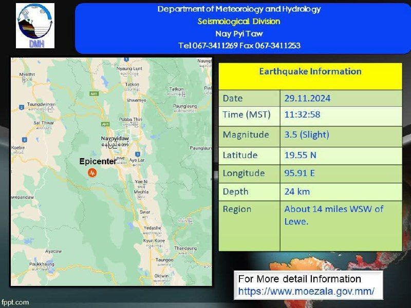 据缅甸气象与水文局发布的消息,今天(11月29日)上午11:32分,内比都 雷韦(လယ်ဝေး)镇西南14英里处为中心发生了一次震级3.5级的地震。