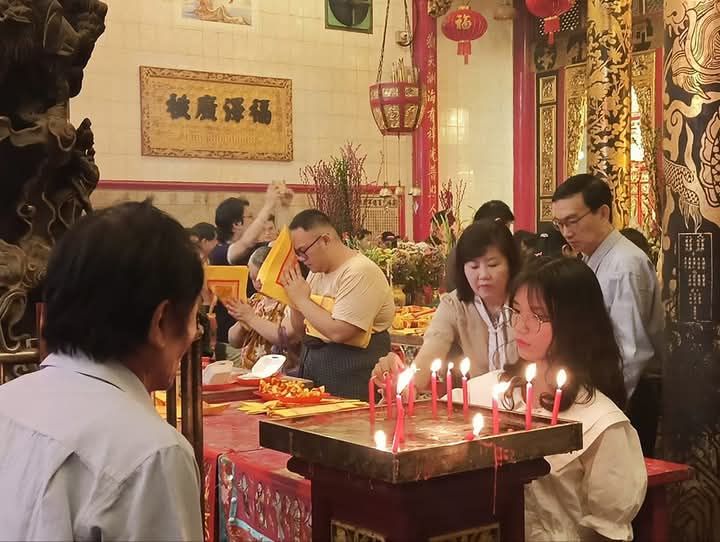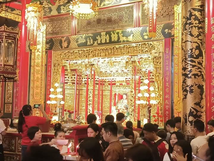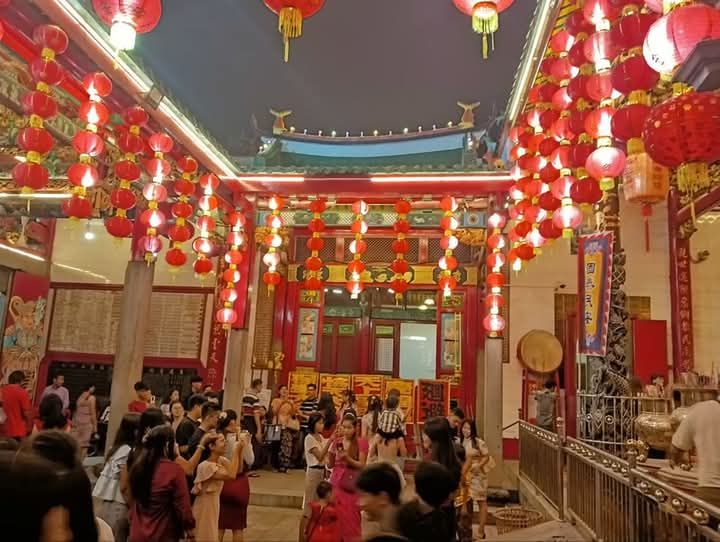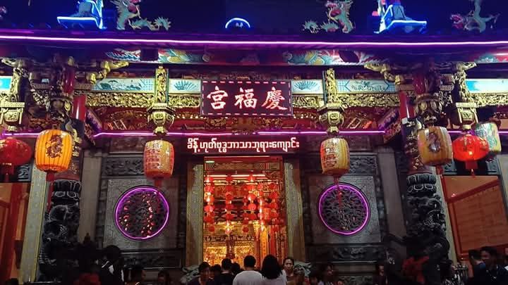 1月29日春节当天,仰光省拉达镇区(လသာမြို့နယ်)位于စဥ့်အိုးတန်း路与ကမ်းနား路交叉口的庆福宫,寺庙内外悬挂了大量灯笼和彩灯,从早上开始就挤满了前来祈福的信众,现场十分热闹。