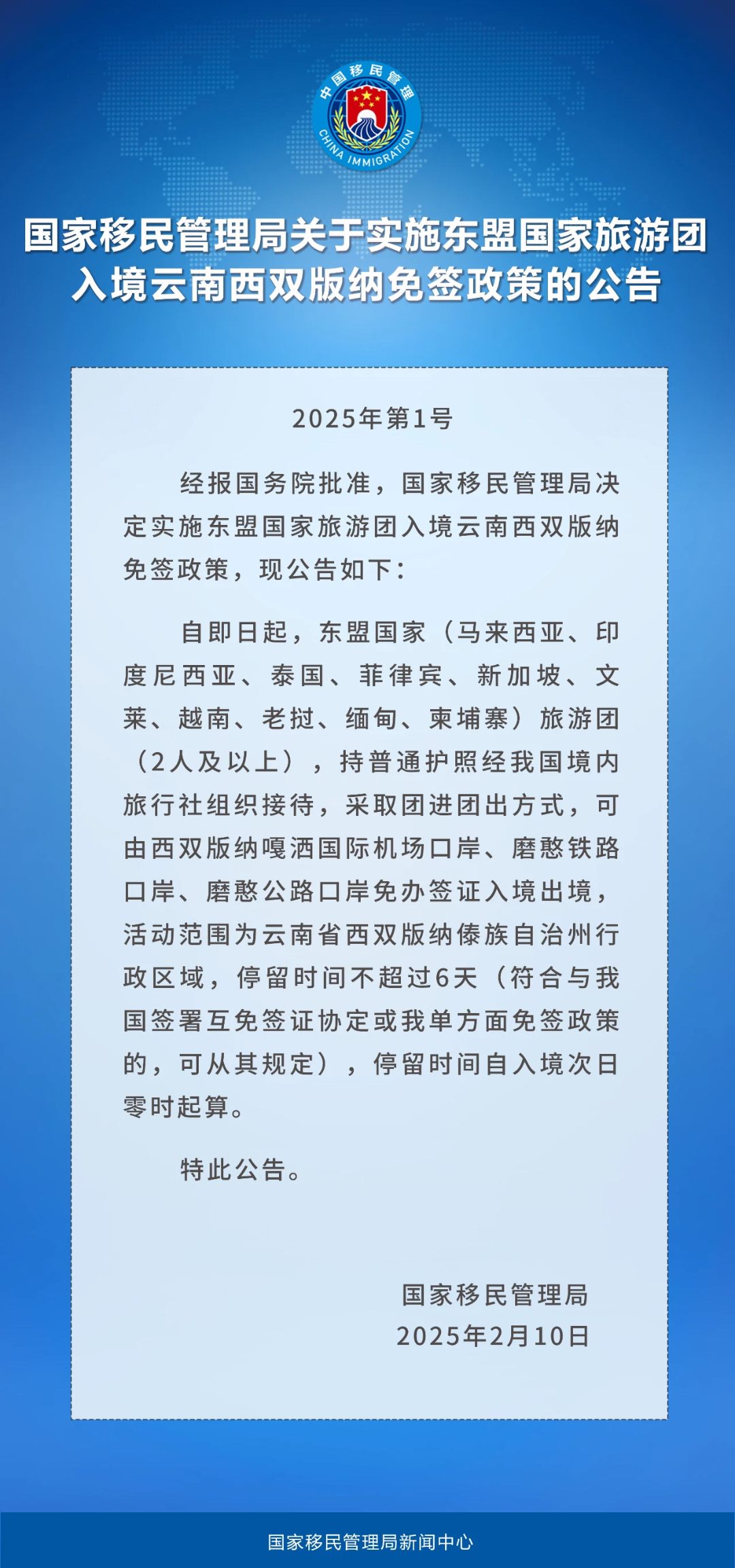 中国国家移民管理局2月10日发布公告称,从2月10日起,东盟10个国家(马来西亚、印尼、泰国、菲律宾、新加坡、文莱、越南、老挝、缅甸、柬埔寨)的旅游团可以免签进入云南西双版纳。
