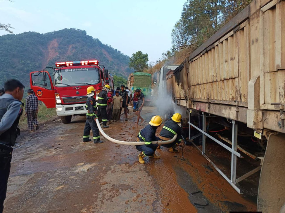 2月20日下午4点45分左右,掸邦莱林镇区发生一起货车起火事件。当时一辆满载水泥的货车正行驶在东枝到景栋的联邦公路上。车子开到孟崩(မိုင်းပွန်)到莱林之间的路段时发生意外。具体位置在163/1到163/2英里柱之间。货车轮胎因为过热引发了火灾。莱林县消防局的队员迅速赶到现场。他们联合其他相关部门展开扑救。大火最终在下午5点15分被彻底扑灭。