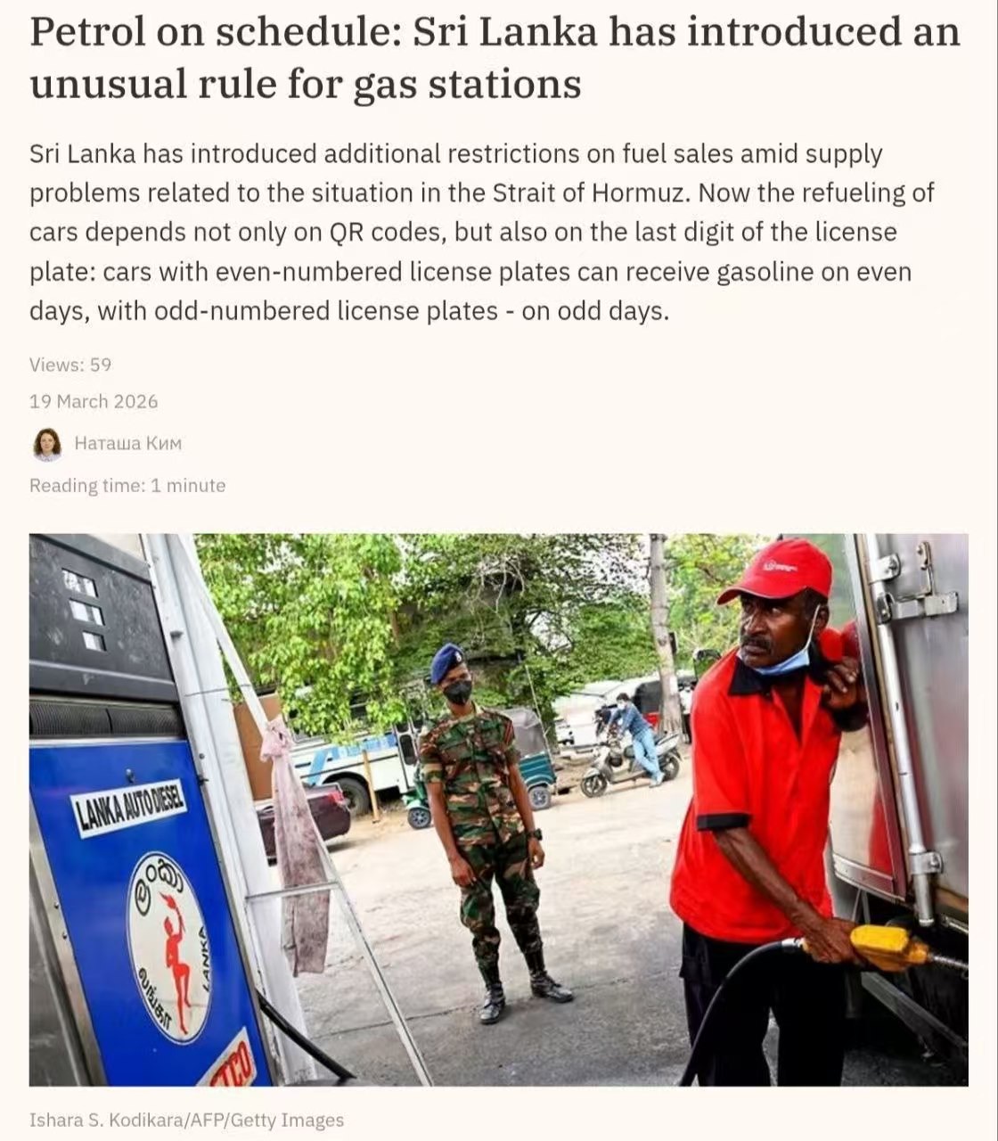 受霍尔木兹海峡局势影响,斯里兰卡目前面临燃油短缺问题,政府决定加码限制燃油销售。现在机动车加油不仅要用二维码系统,还要看车牌尾号,尾号是双数的车只能在双数日加油,尾号是单数的车只能在单数日加油。这项新规定由锡兰石油公司牵头制定,相关措施已经在3月19日正式生效。官方希望这些举措能缓解加油站大排长龙的情况,同时也能让有限的燃油分配得更加公平。