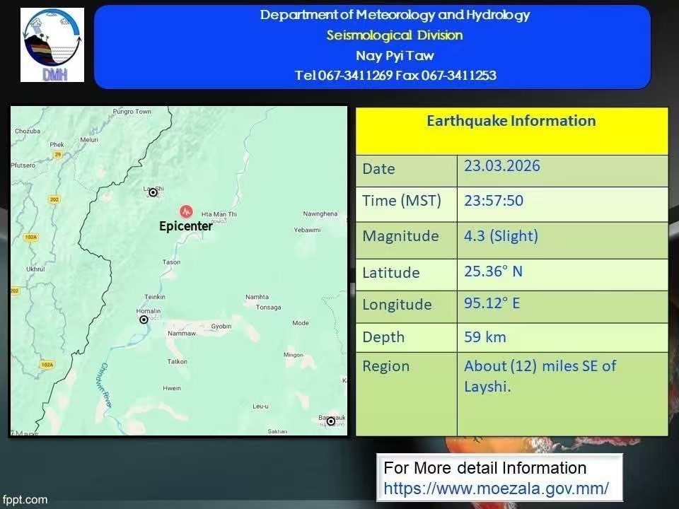 3月23日晚上实皆省那加自治区发生轻微地震,震中位于勒西镇(လေရှီးမြို့)东南方向约12英里处,发生时间是晚上11点57分50秒,震源深度59公里,震级4.3级,这是缅甸当天的第二场地震。当天晚上6点14分11秒还发生了一场轻微地震,震中在彬马那镇西南方向约5英里处。震源深度12公里,震级4.4级。