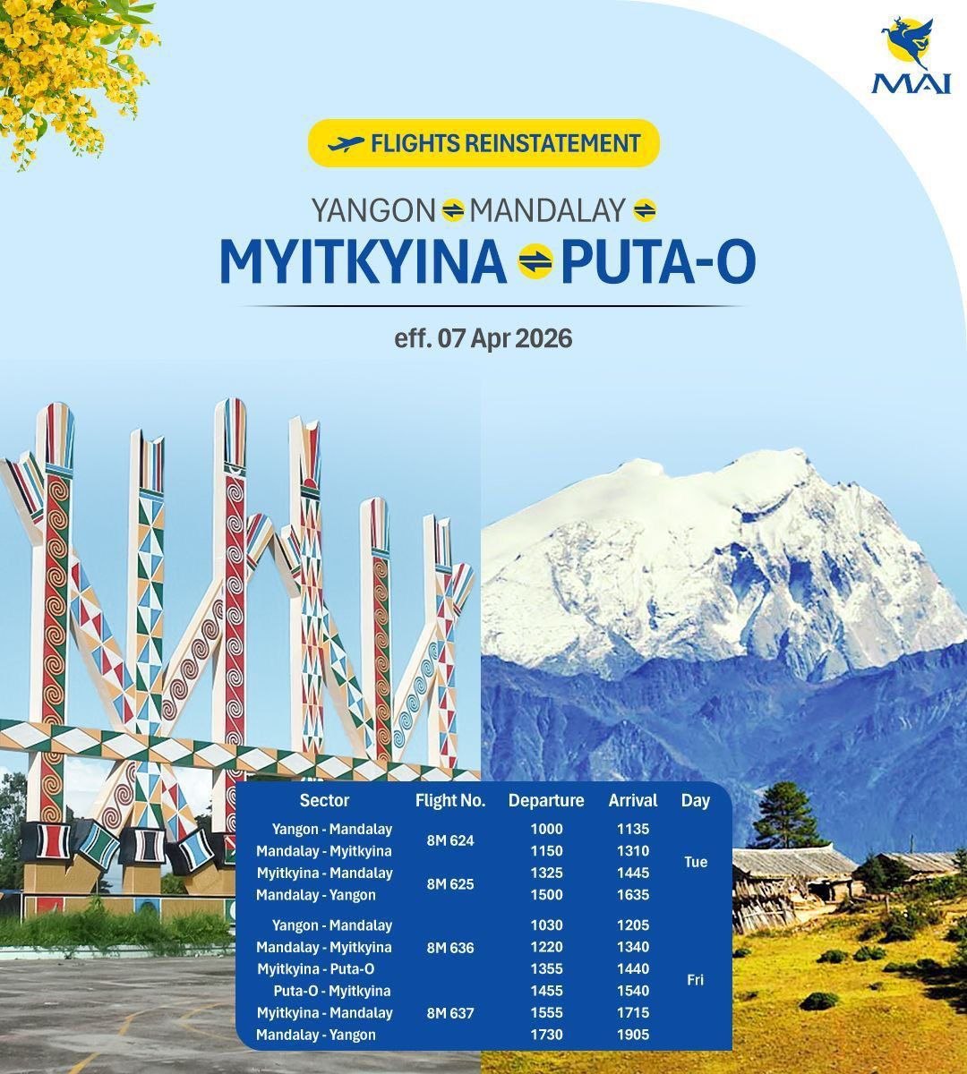 缅甸国际航空为了方便旅客出行。公司决定从4月7日开始。恢复飞往克钦邦密支那和葡萄的航班。仰光飞往密支那的航班每周有2班。分别在每周二和周五起飞。仰光飞往葡萄的航班每周只有1班。固定安排在每周五起飞。