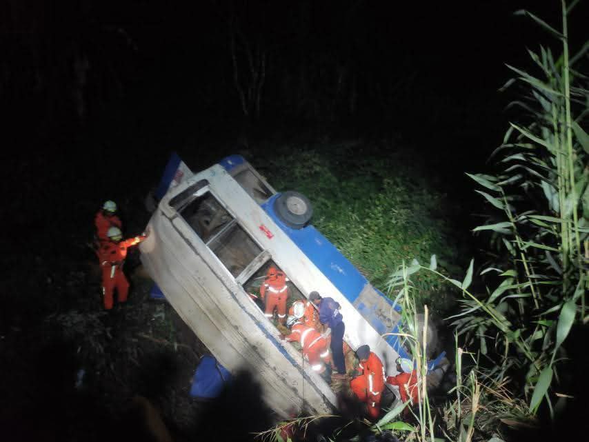 12月6日晚上9点左右,掸邦 格劳镇 ဝက်ဖြူရေ村附近 (61/3)和(61/4)路桩之间,一辆载有三名男子的车发生翻车事故。