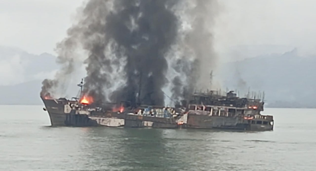 昨天(12月13日)早上6点左右,在德林达依省 高当 တော်ဝင်码头附近海域,一艘货船发生火灾事故。