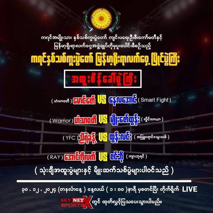 克伦族新年期间,于12月30日,在仰光国家地标花园(တိုင်းရင်းသားကျေးရွာ)将举行缅甸传统拳击大赛。