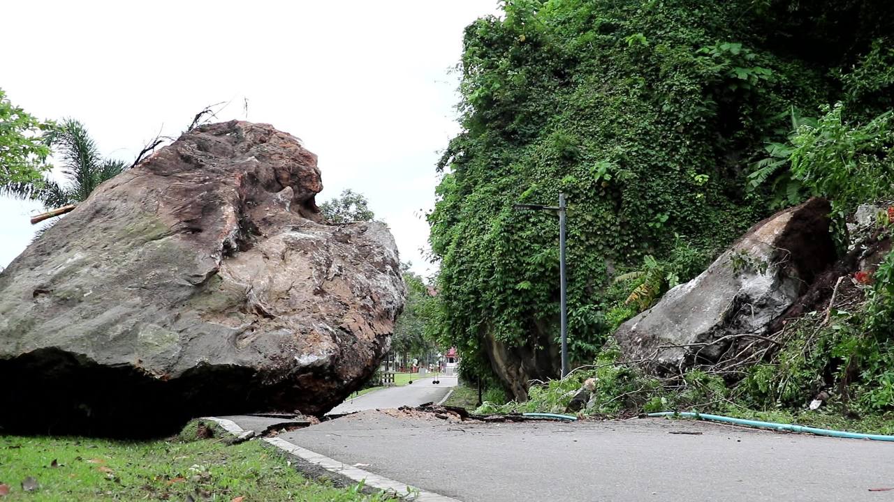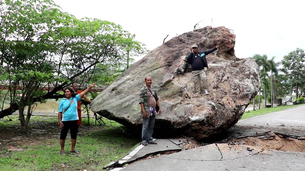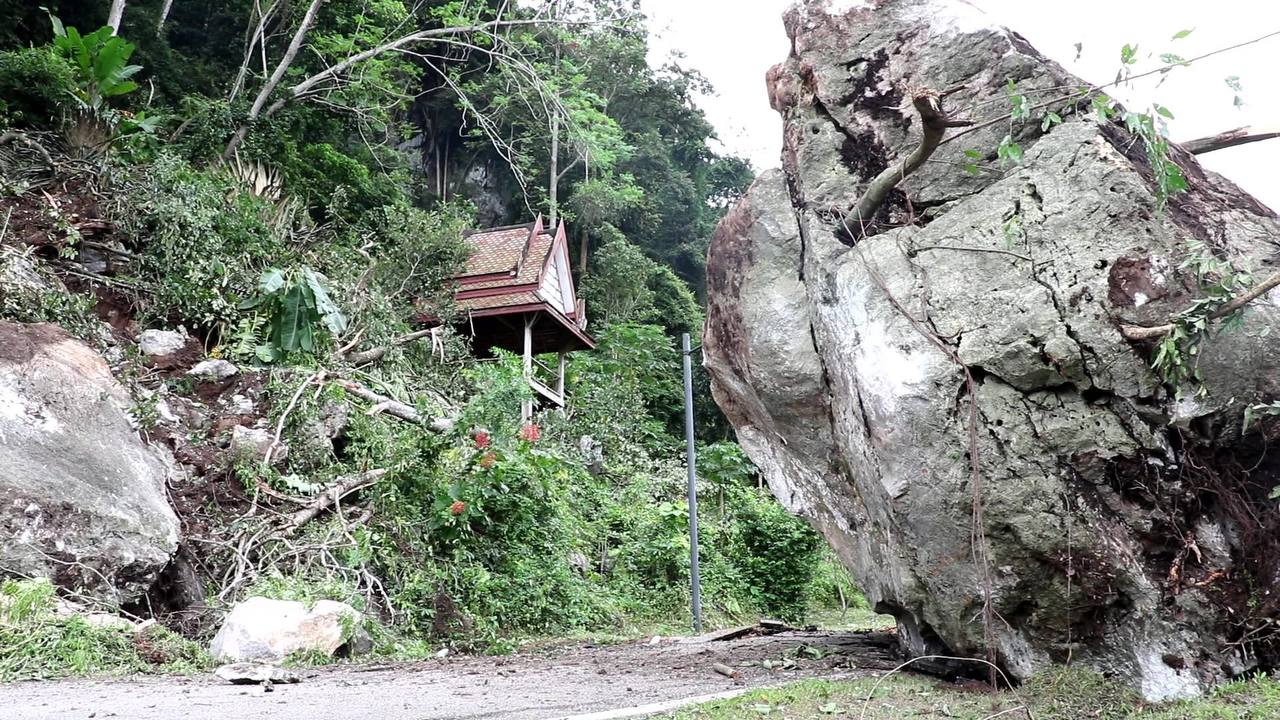 12月29日,泰国春蓬的Wat Ratchaburana(Wat Nok)寺庙内,一块20多吨的巨石从40米高山崩落,砸向马路。