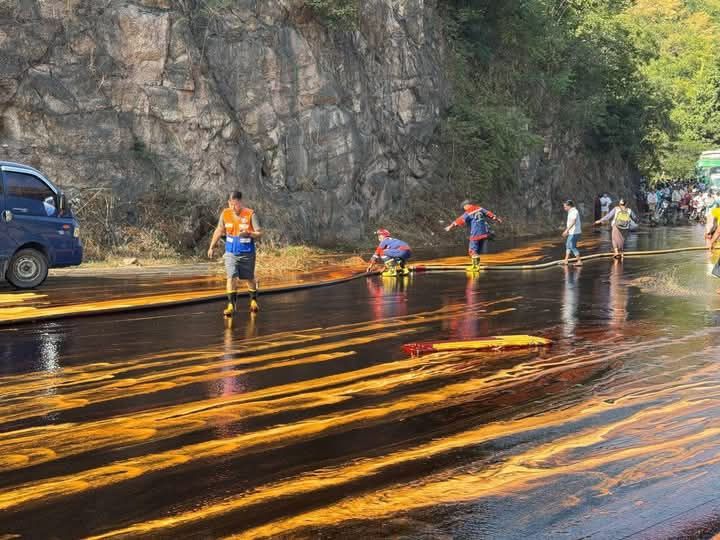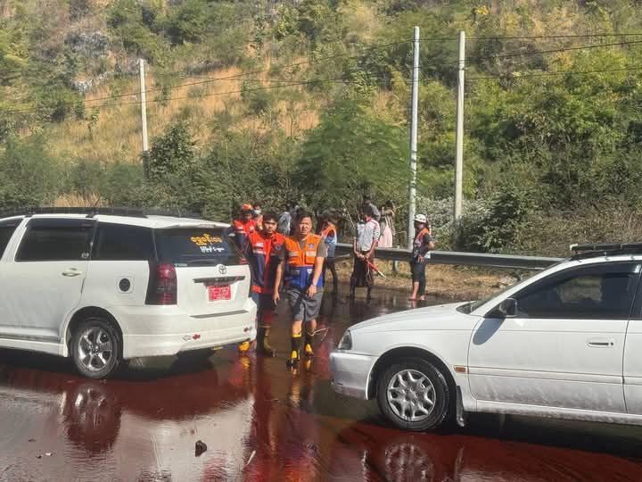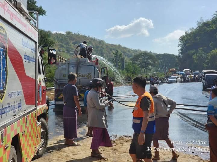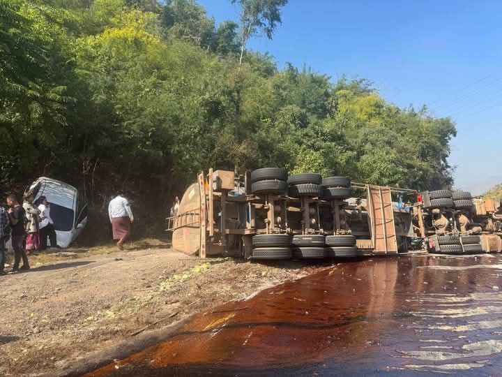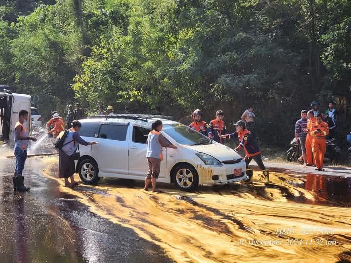 曼德勒 — 彬乌伦公路18英里附近,一辆糖蜜罐车发生翻覆,导致大量糖蜜泄漏。公路从今天上午10点半左右开始临时封锁。救援人员正将受伤人员送往医院,同时努力尽快清理现场以恢复道路通行。
