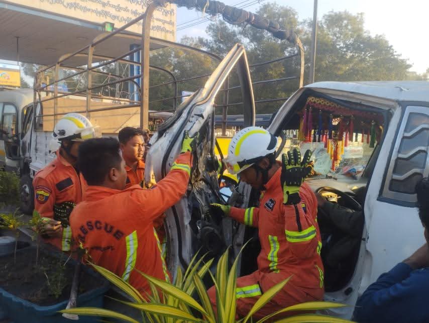 2025年1月9日约早上7点,在缅甸仰光省岱枝镇区(တိုက်ကြီး)塔固村组(တာဂွ)的仰光—卑公路(ပြည်)上发生了一起交通事故。岱枝镇消防站派出一辆消防车及救援队展开救援行动。事故中,两名男子被困车内受轻伤,7点27分成功将两人救出,并由မိုးစေတနာ公益组织的救护车送往达基镇区人民医院治疗。
