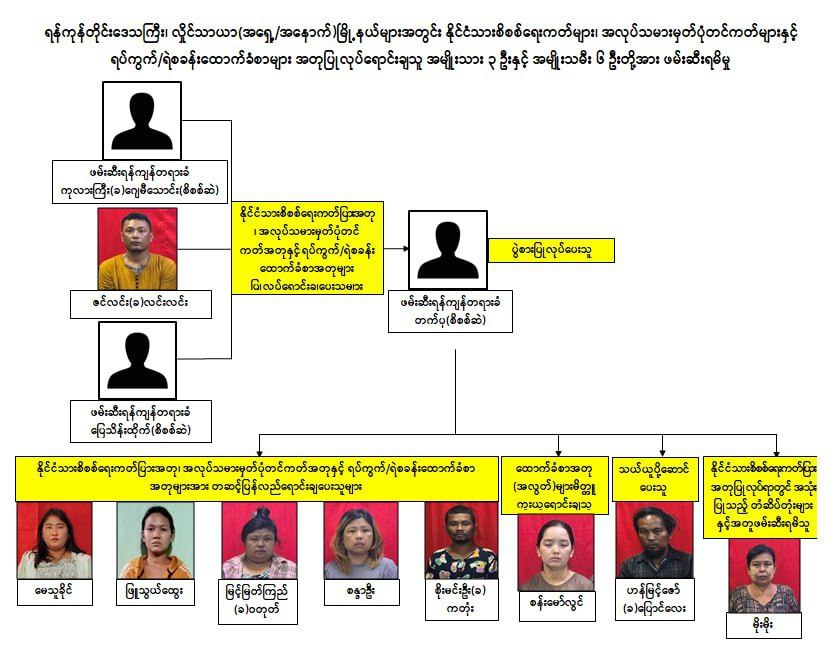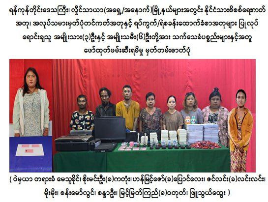 执法人员1月8日在掸邦东枝抓获一名34岁女性,涉嫌出售假身份证和套坎撒。随后,根据线索,在仰光抓获了其他8名涉案人员。