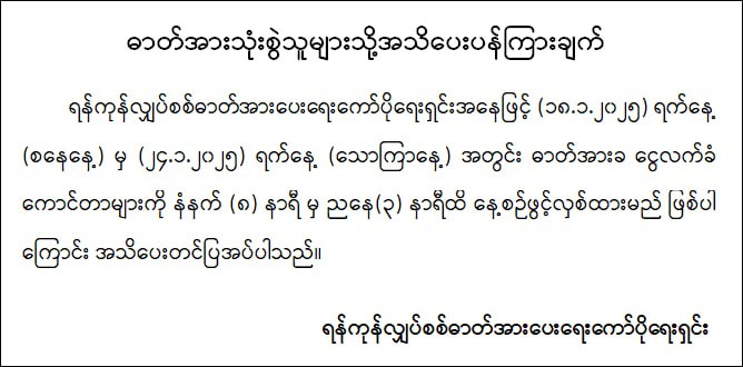 仰光电力公司通知,从1月18日到1月24日,电费缴纳柜台将每天从上午8点到下午3点开放。