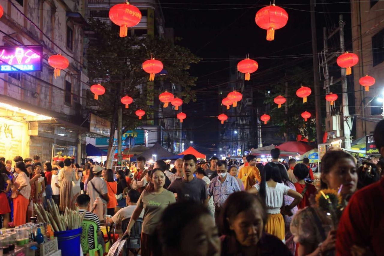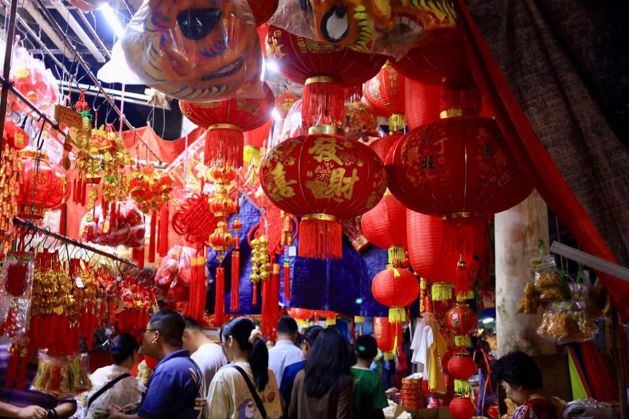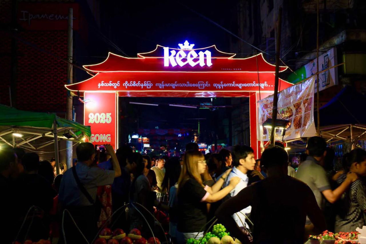 2025年“蛇年”春节集市在仰光市拉达镇区举行的晚上热闹场景。