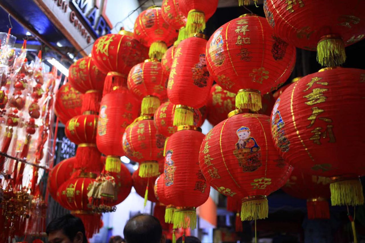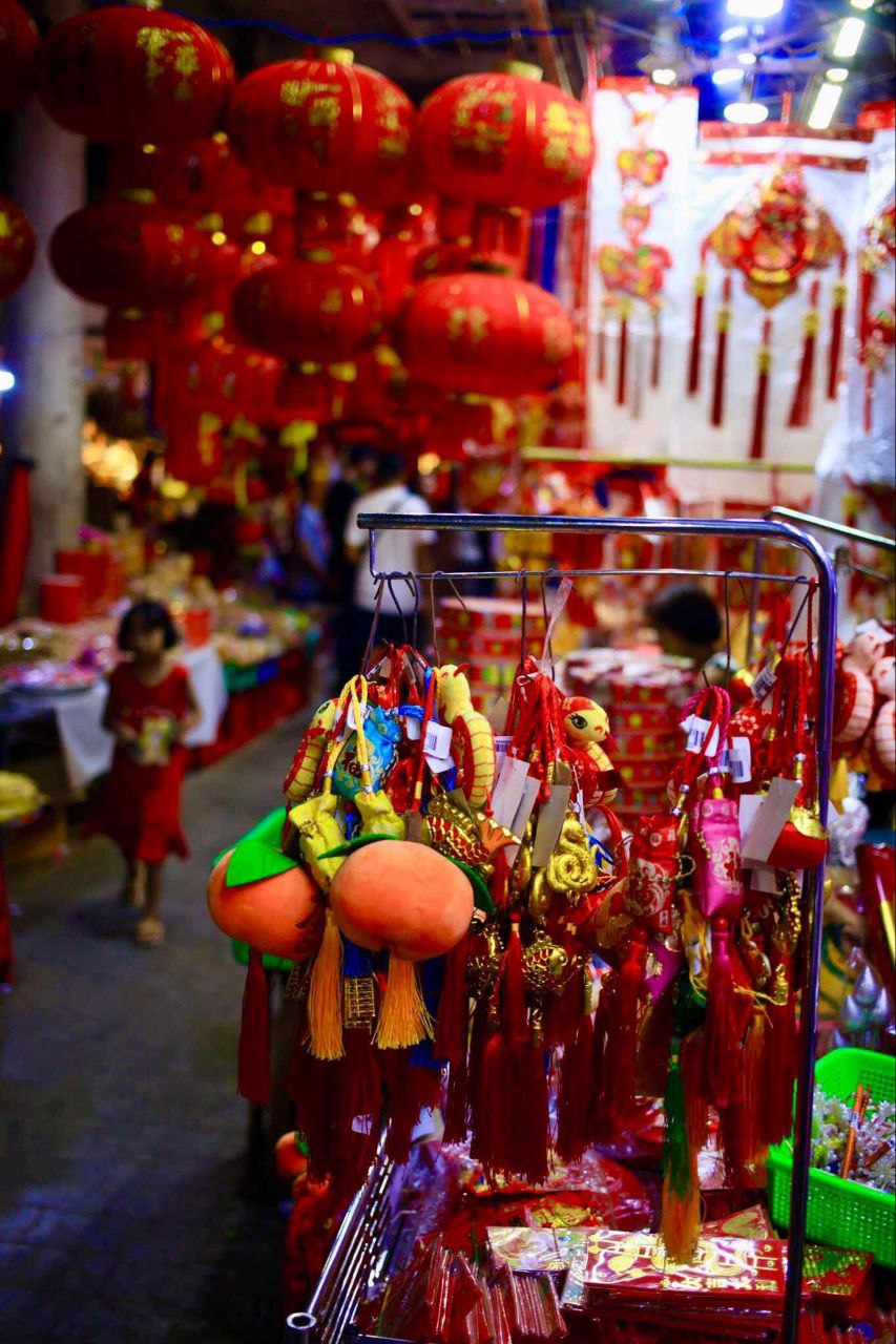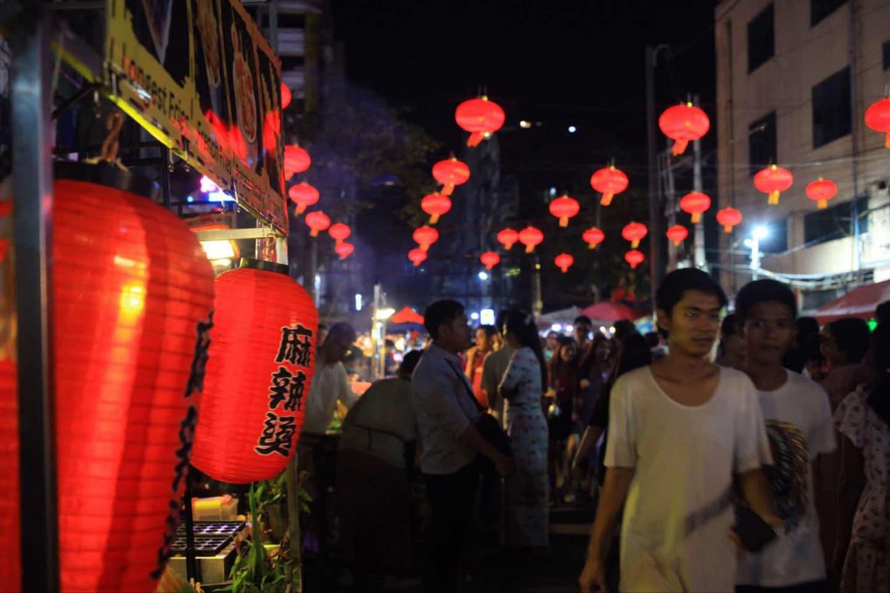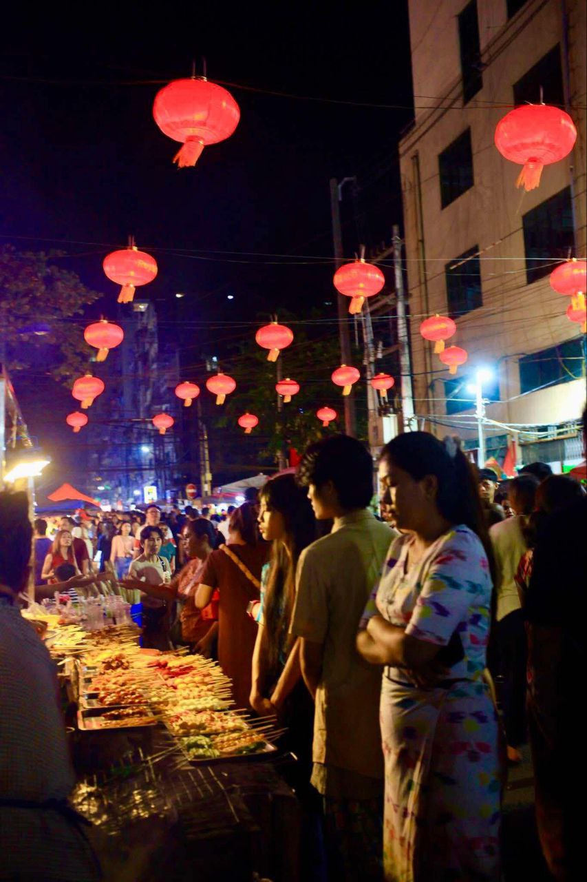 2025年“蛇年”春节集市在仰光市拉达镇区举行的晚上热闹场景。