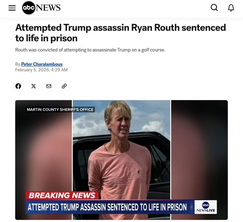 2月4日,美国佛罗里达州西帕尔姆滩(West Palm Beach)高尔夫俱乐部刺杀特朗普未遂案有了结果,被告人瑞安·韦斯利·劳思(Ryan Wesley Routh)被判处终身监禁,还要额外再服刑7年。这名59岁的男子在去年9月23日被陪审团认定犯有5项联邦罪行,其中就包括在总统大选期间企图暗杀前总统。案情显示,劳思为了杀害特朗普已经提前策划了好几周,事发时他正躲在灌木丛里用步枪瞄准正在打球的特朗普,好在还没来得及开枪就被发现了。