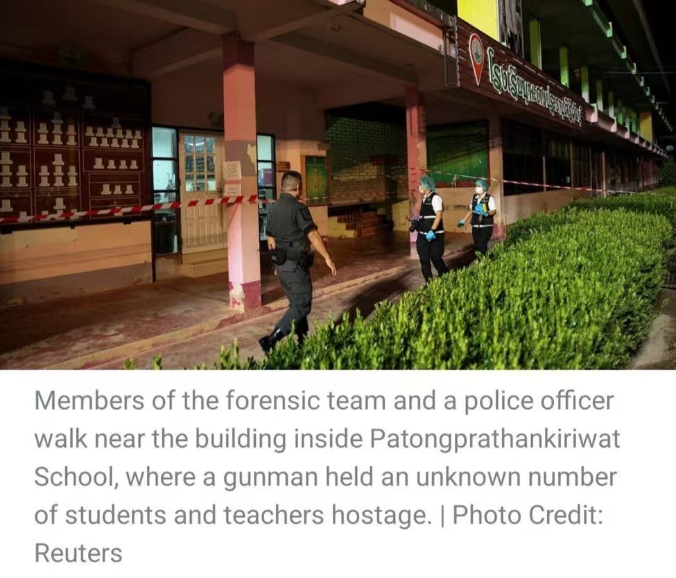 泰国南部宋卡府(Songkhla)行政机构发布通报称,2月11日,合艾县(Hat Yai)发生了一起恶性校园枪击事件。一名17岁的少年拿着从警察那里偷来的枪,闯入佩通普拉坦基里瓦学校(ပေထောင်ပရာထန်ကီရီဝပ်),开枪射杀了女教师萨西帕·辛萨莫松(ဆာစီဖတ် ဆင်ဆမ်မိုဆွန်)。虽然警方随后抓获了凶手,但这起事件还造成一名女学生中弹受伤,目前官方还没有公布这名学生的具体伤情。