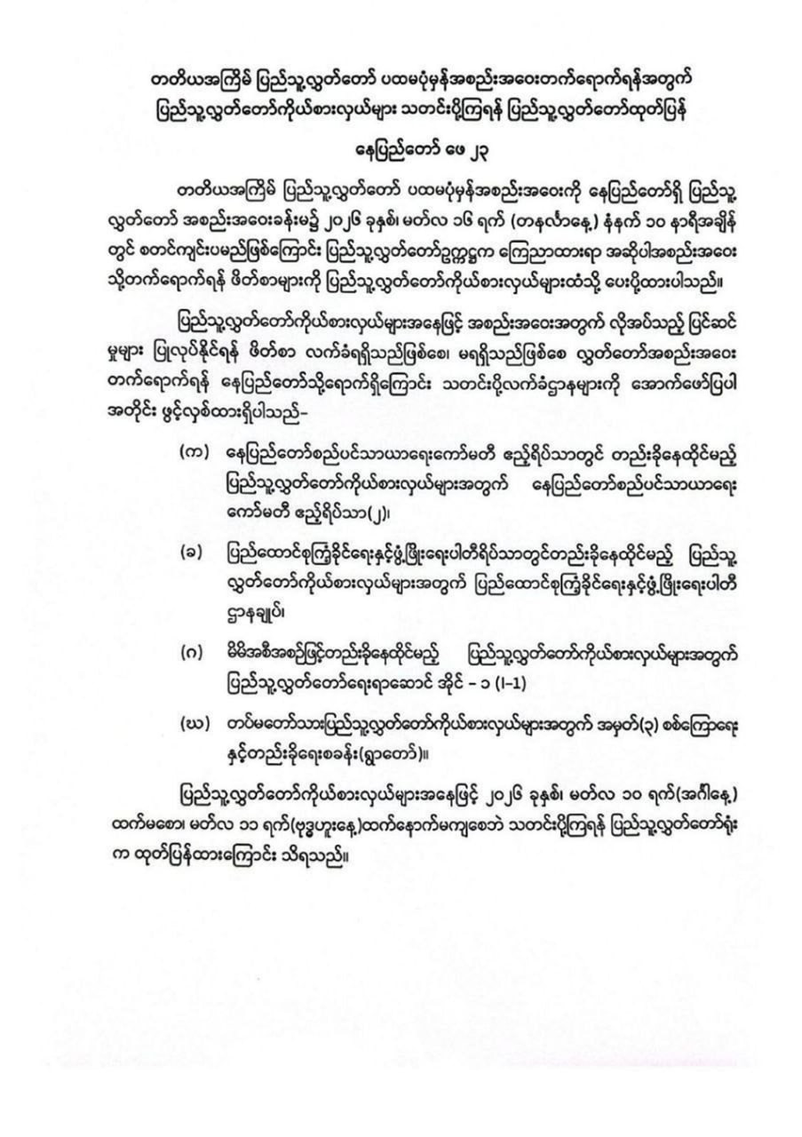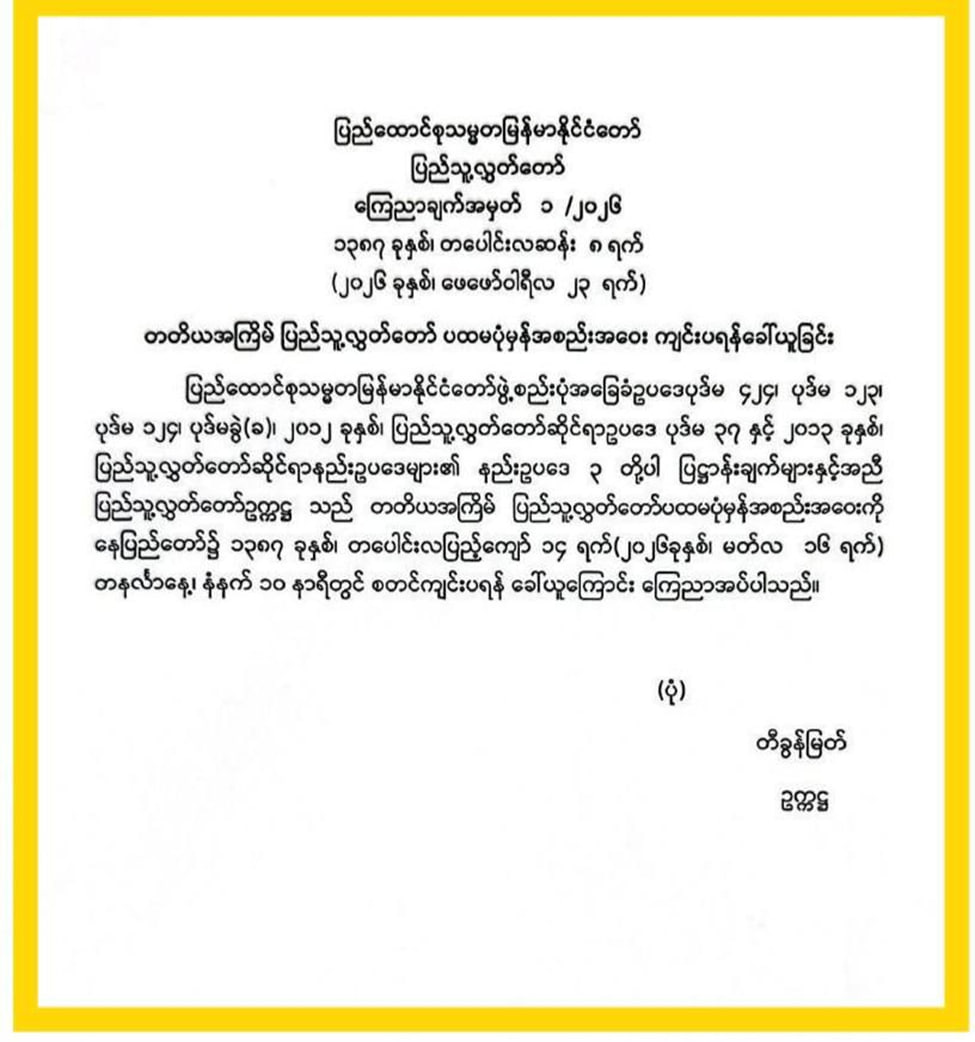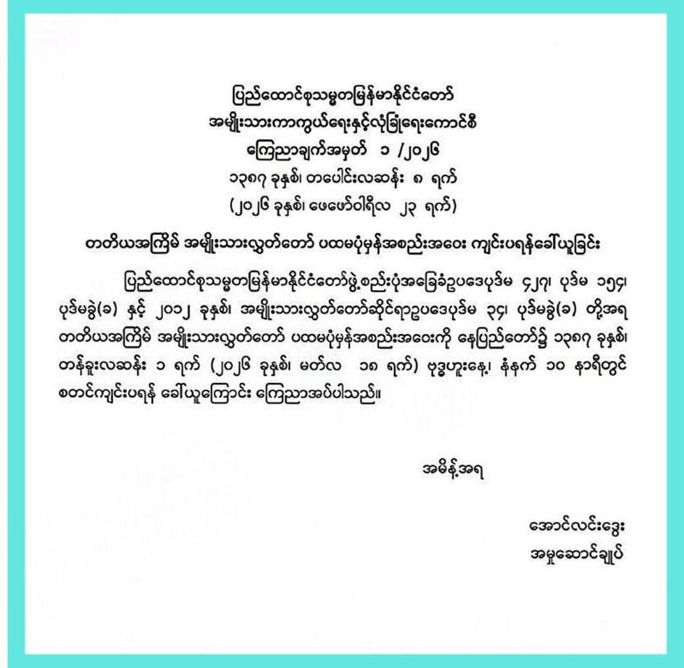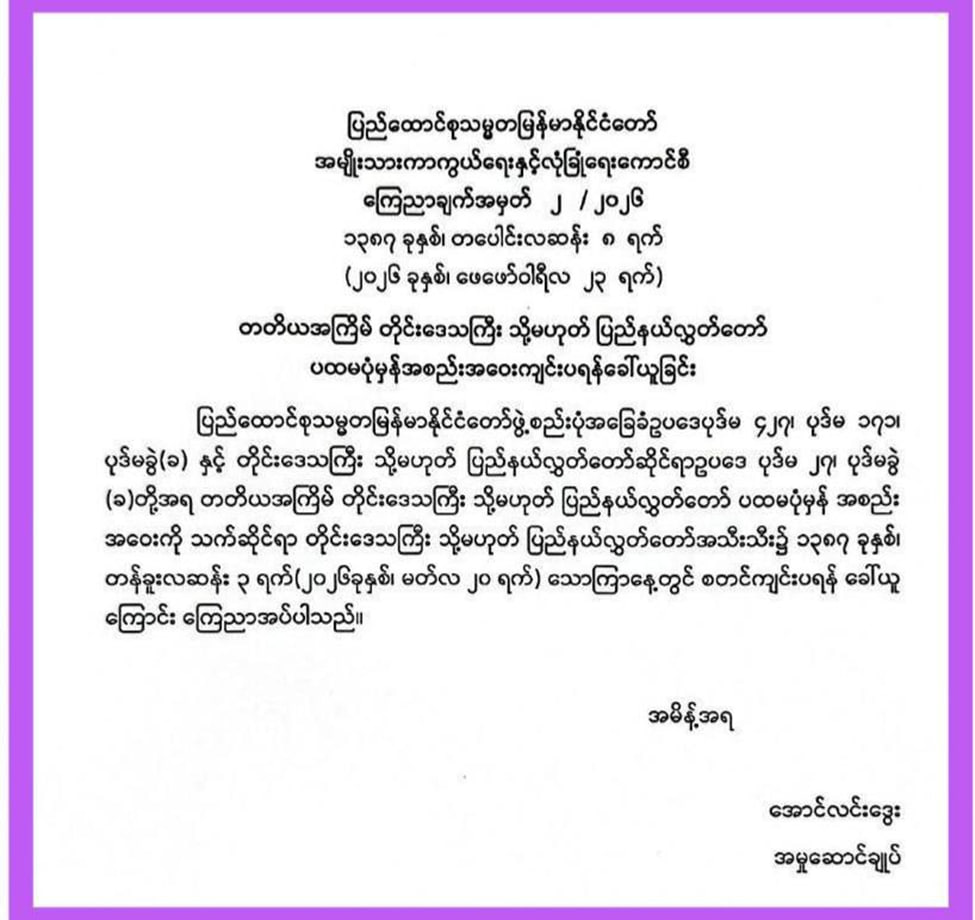 缅甸官方2月23日发布了最新的议会日程。第三届各级议会的第一次例会时间正式敲定。人民院议长迪昆妙对外发布了这份公告。人民院会议安排在3月16日率先开幕。民族院会议紧随其后在3月18日举行。各省和邦的议会会议安排在3月20日召开。到时候省邦议员将在各自的议会大厅集中开会。