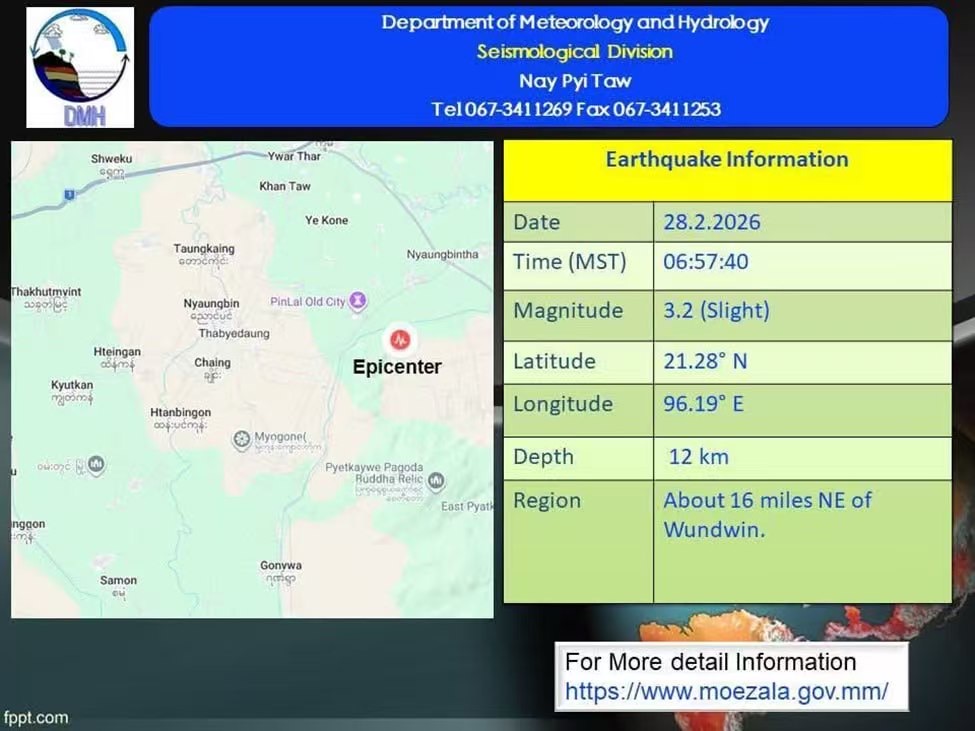 缅甸气象与水文局发布了最新地震消息称,2月28日早上6点57分40秒,文敦发生了一次轻微地震,震中位于文敦东北方向大约16英里处。震源深度为12公里,震级是里氏3.2级。就在前一天,也就是2月27日上午11点51分2秒,彪关(ဖြူး)东边约34英里处也发生过一次地震。那次地震的震源深度是8公里,震级为里氏3.5级,同样属于轻微地震。