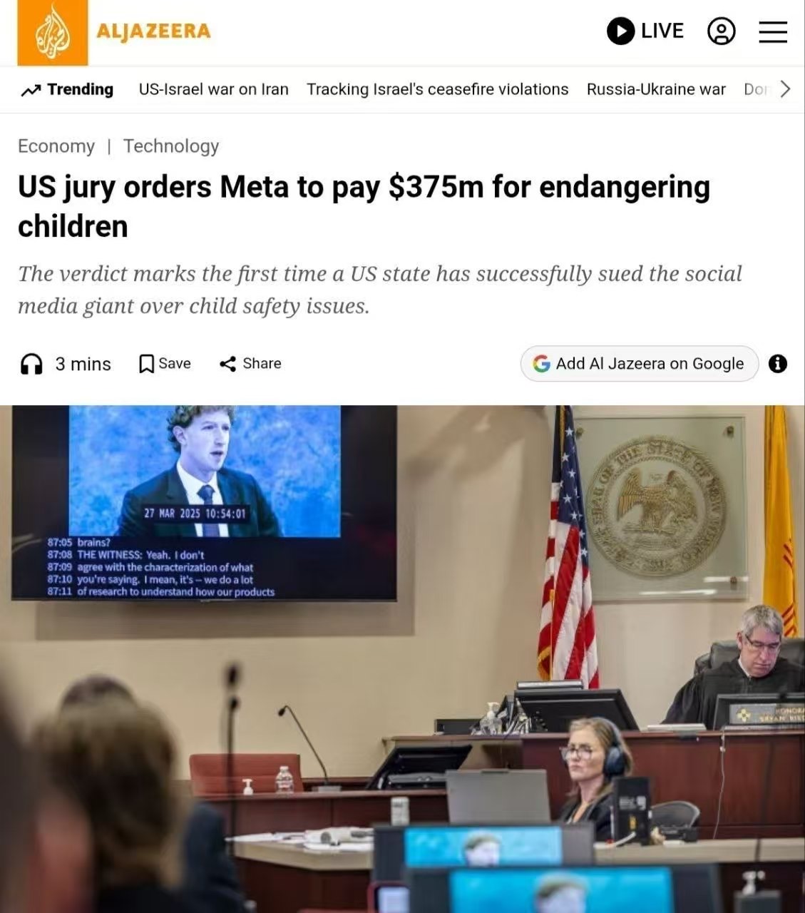 社交媒体巨头Meta公司因为损害儿童心理健康,还让孩子们面临性剥削风险,被美国一个陪审团裁定赔偿3.75亿美元,这项裁决是新墨西哥州陪审团经过6周审理后在周二做出的。州政府指控这家科技巨头没有保护好儿童,陪审团听取了包括前员工吹哨人在内的40名证人的证词,还审查了成百上千份文件、报告和电子邮件。新墨西哥州针对Meta的第二阶段诉讼安排在5月开庭,到时候法官会听证,决定要不要让Meta交更多的罚款,以及强制他们修改平台和公司运营规则。与此同时,加利福尼亚州的另一个陪审团也在审理,评估Meta和YouTube平台导致儿童上瘾等伤害问题,看他们需不需要为此承担责任。